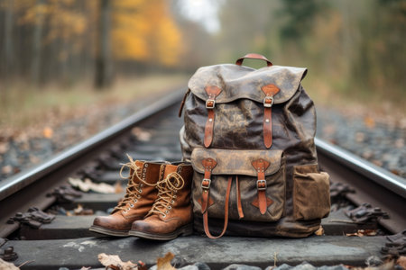 aged leather boots near a travelers backpack outdoors, created with generative ai