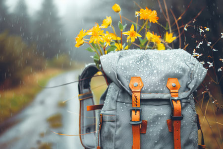 A gray backpack adorned with yellow wildflowers is on a rainy trail, symbolizing adventure and connection with nature