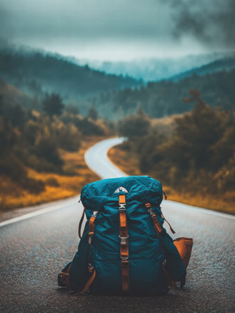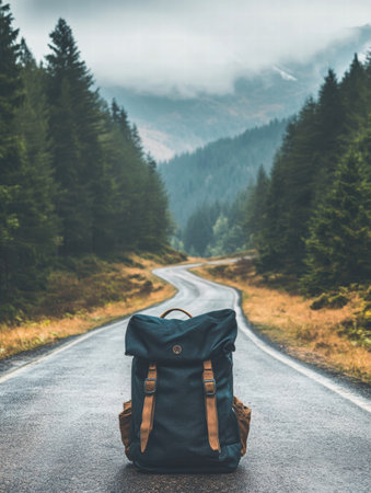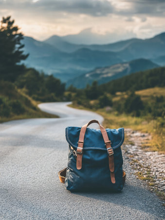A travelers backpack is placed on a scenic winding road with mountains and lush forests under a cloudy sky, inviting adventure.