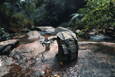 Bonfire,Outdoor at a waterfall in a tropical rainforest,