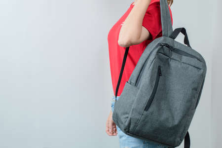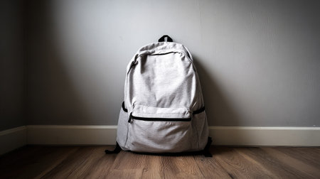 A stylish gray backpack stands alone against a wall in a modern interior, highlighting its simple design and functional storage options for travel or school.