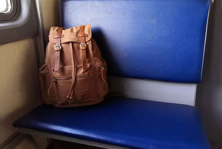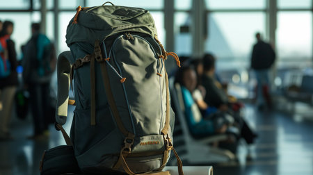 Hiking backpack in the airport terminal. Travel and tourism concept.