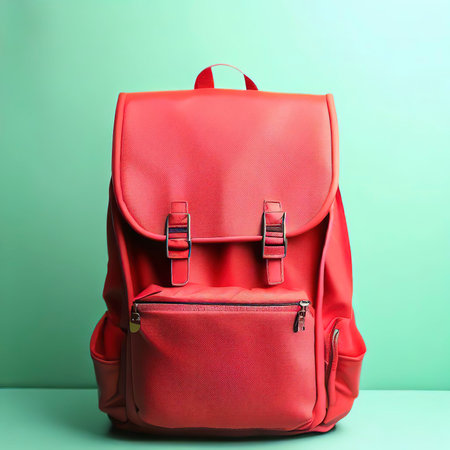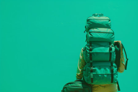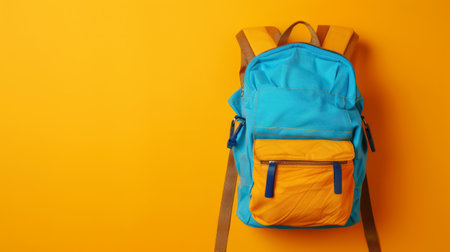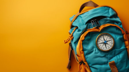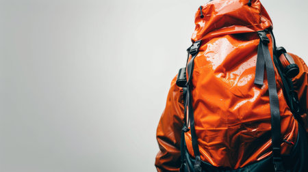 A minimalist image showing a bright orange backpack on a simple, light blue backdrop. This simple yet impactful image symbolizes adventure, travel, and exploration. Generative AI