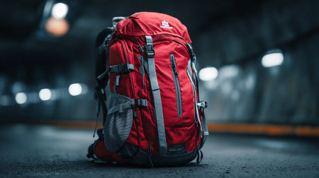 Striking Red Backpack Ready for Adventure Against a Dark Urban Backdrop