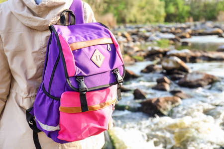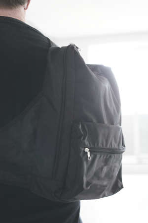 Hipster backpack closeup. View from front tourist traveler bag on urban background.