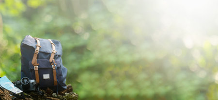 Tourist backpack, hat, binoculars and a map on a log in the forest. Concept of hiking, hiking in the mountains. Banner.