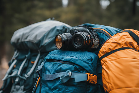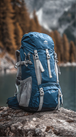 Durable Blue Hiking Backpack with Orange Straps for Outdoor Adventures, Featuring Multiple Compartments and Secure Fastenings, Perfect for Camping, Backpacking, and Day Trips on Rugged Terrains AI Generative