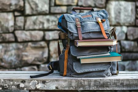 A book bag filled with textbooks and supplies placed on top of a wooden table, A backpack overflowing with textbooks and supplies
