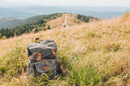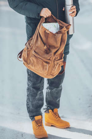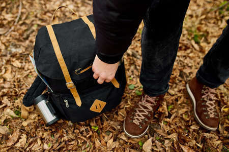 Tourist man looking into his backpack, Travel concept, Autumn background landscape, travel accessory, relaxing, autumn, break Digital wellbeing, limiting screen time, mindful living, local travel, mental health. Copy space
