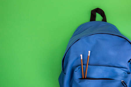 Back to school, education concept. Yellow backpack isolated on blue background. Top view. Copy space Flat lay composition Student accessory