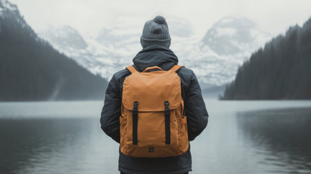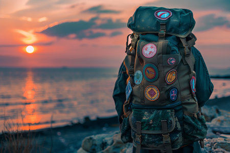 As the sun sets over the tranquil lake, a hiker stands quietly, gazing at the vibrant sky. Their backpack, adorned with colorful patches, symbolizes adventurous journeys.