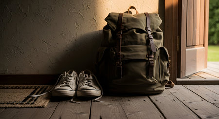 A green canvas backpack and a pair of worn white sneakers sit on a wooden floor next to an open door. Sunlight hits the wall, suggesting preparation for an outdoor adventure, a hike, or a journey.