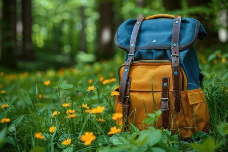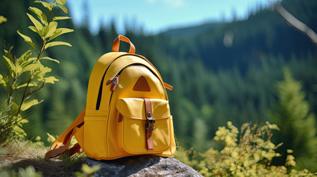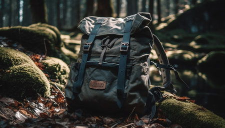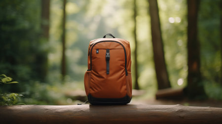 Stylish minimalist backpack on forest log with lush greenery in background. concept of outdoor exploration, adventure gear, nature hiking equipment.