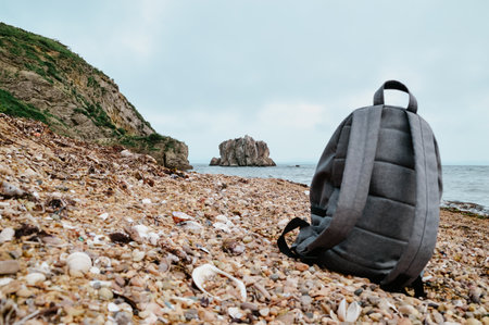 Backpack on an empty beach on a gloomy day, Japanese sea, Russia