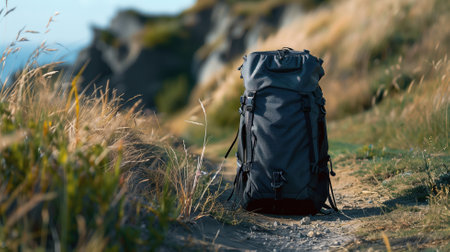 Sturdy backpack on a sandy coastal hiking trail at sunset