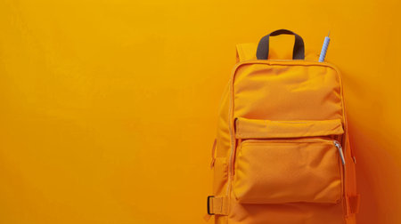 School bag. Backpack with rulers for school on yellow background. generative ai