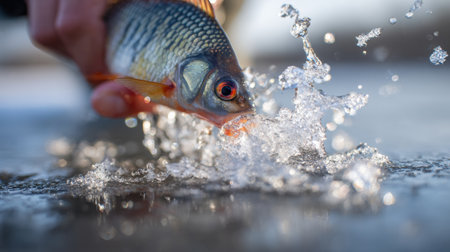 Fisherman pulls a fish from a frozen water hole as icy splashes surround the catch in a winter setting with natural light