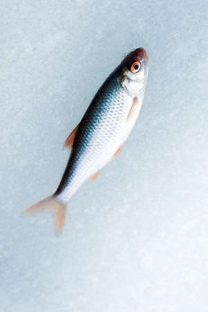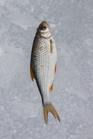 Caught fish roach with Rudd lie on the white snow of the lake. Background. Top view, lat lay.