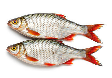 Two whole, uncooked rudd fish are presented side-by-side on a clean white background, showcasing their silver scales and vibrant orange fins.