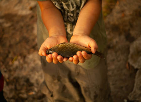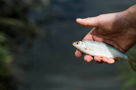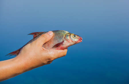 Fisher man holding in his hand caught, river fish on the background of the river.