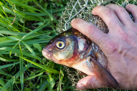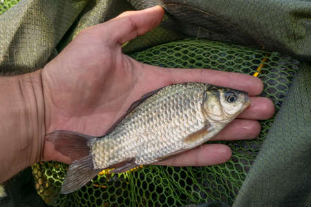 Live crucian carp fish in fisherman hand above fishing keeping net