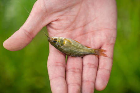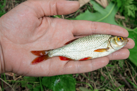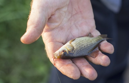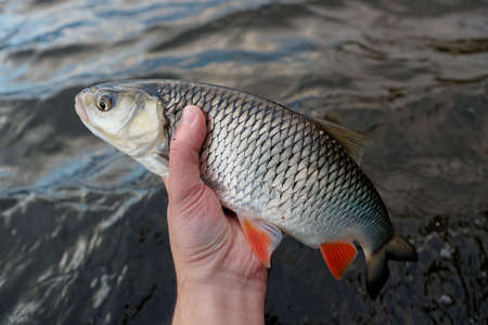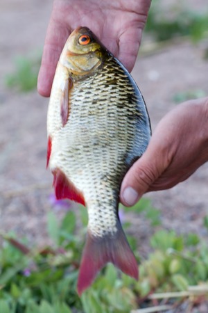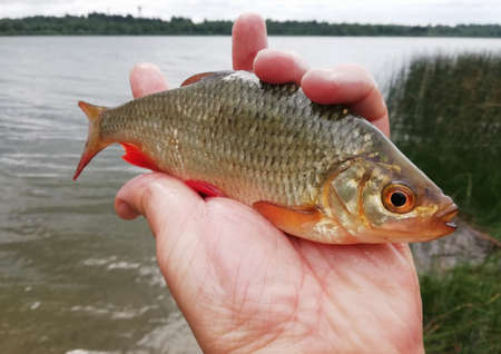 Fishing. A man holds a caught fish in his hand. A roach with orange fins.