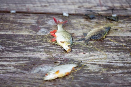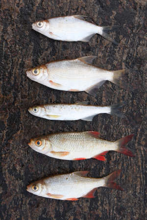 Freshwater roach fish just taken from the water. Several of roach fish on the withered grass. Catching fish - common bream (Abramis brama), common roach (Rutilus rutilus).