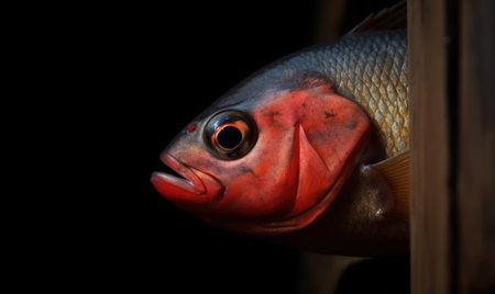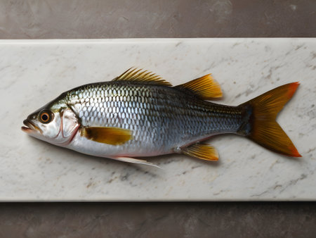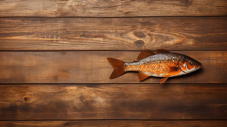fresh fish lies on a rustic wood table, its scales glistening in the light, surrounded by scattered fresh parsley and lemon slices, evoking a sense of seafood culinary delight, perfect for a summer dinner party or a seafood restaurant menu. ai generated