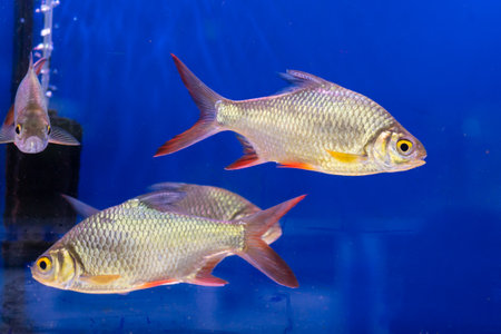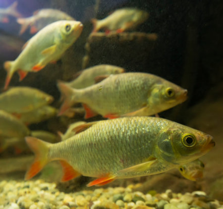 Roach or rutilus from carp fish family in public aquarium in city of St. Petersburg in Russia.