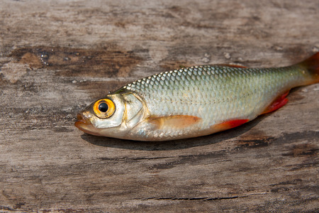 Freshwater fish just taken from the water. Single common rudd fish on the old tree trunk with brown bark.