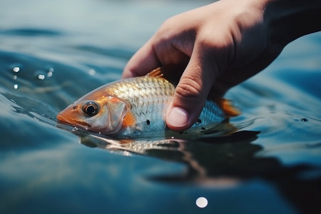 Hand holding multi colored fish in tropical fish tank underwater generated by artificial intelligence