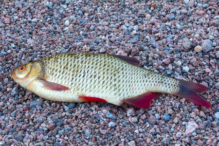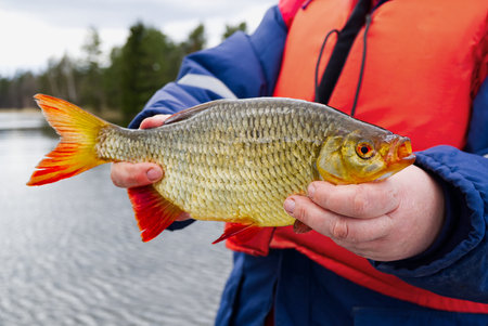 Freshwater fish just taken from the water. Close up view of single common rudd fish in hand.