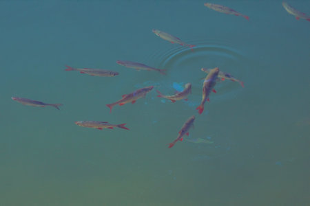 Small freshwater fish swim and play in sunny weather in a pond or in a river. Soft Focus