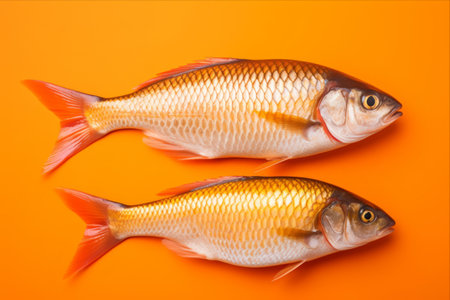 Two fish river roach on orange background. Concept of kitchen, food preparation, shop windows, market. fishing concept.