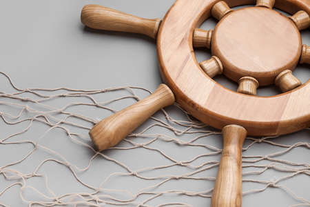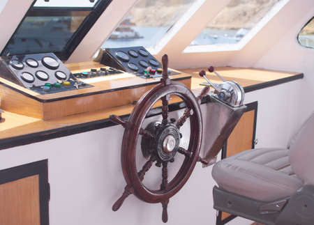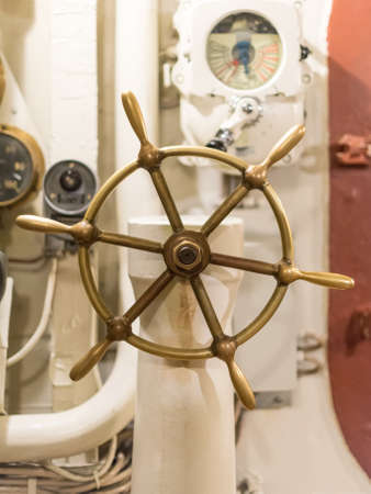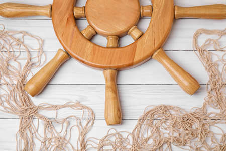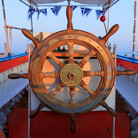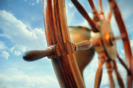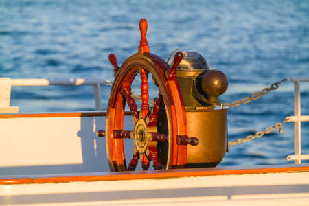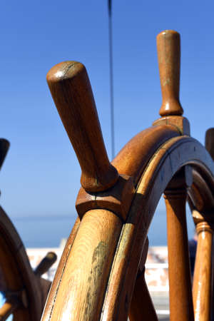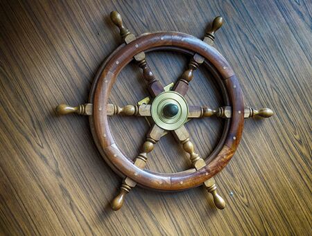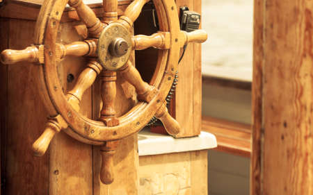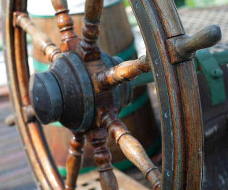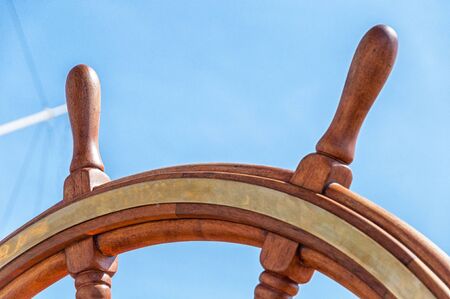 Closeup of helm rudder on ship or yacht, ship wooden old steering wheel