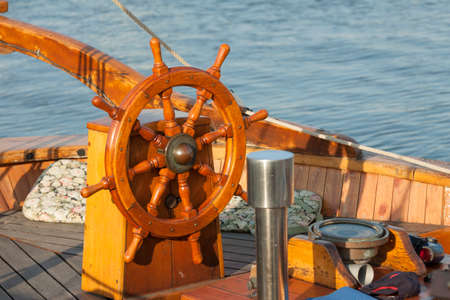 Yachting. Sailboat view of different parts of yacht. Ship wooden old steering wheel.