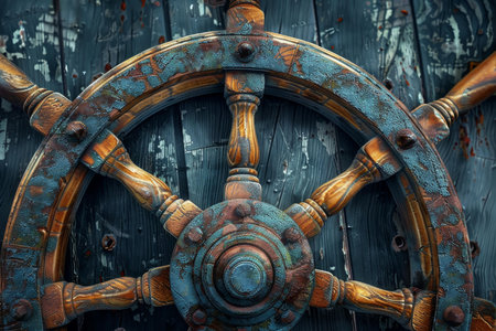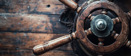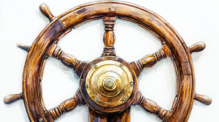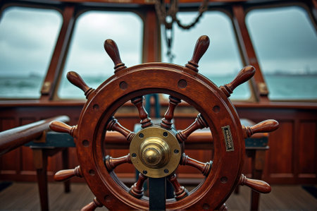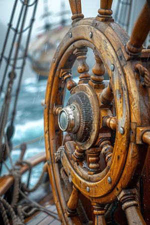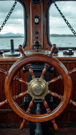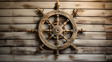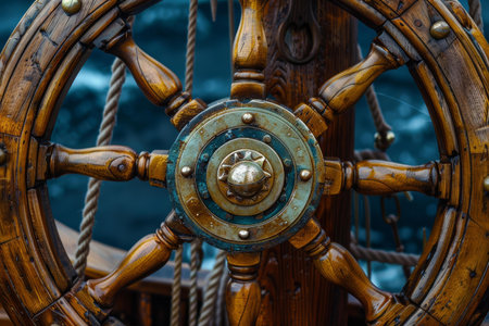 The intricate wooden ship's wheel, adorned with brass, reflects maritime heritage and artistry, capturing the essence of navigation by the sea.