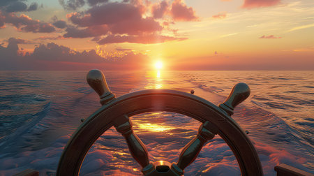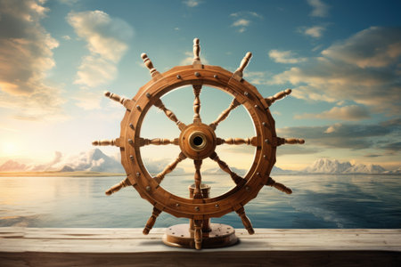 Wooden ship wheel in close-up with ocean and dramatic sunset sky background, concept of travel, journey, vacation, and nautical exploration
