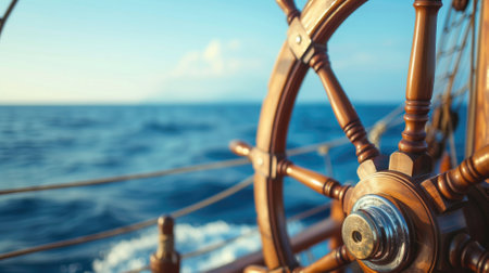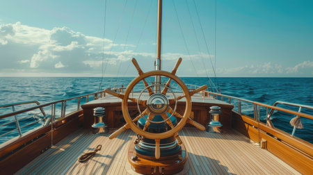 the ship wheel of a sleek yacht against the vast expanse of the sea, evoking a sense of freedom and exploration