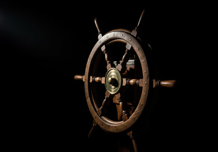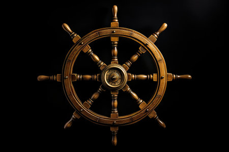Vintage wooden ship's steering wheel with brass details isolated on a dark black background. The helm has a moody spotlight.