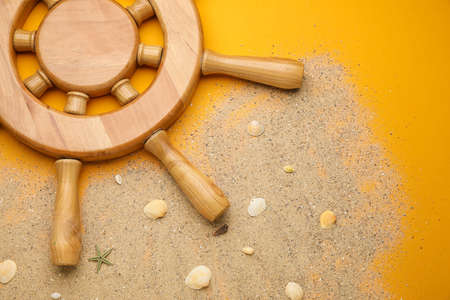 Marine attributes. Wooden steering wheel On a bright pink and yellow background. Top view.