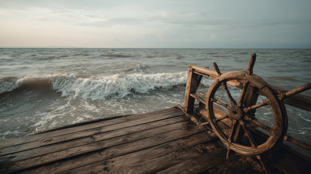 An aged ship wheel rests on a weathered wooden dock with the ocean in the background. The image features a cool color palette with muted tones and natural light. The composition highlights the wooden texture and the vastness of the sea. Suitable for a variety of commercial and editorial purposes.