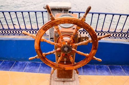 Old Vintage Wooden Helm Wheel near Blue Ovcean