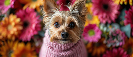 Small dog in pink sweater surrounded by colorful flowers