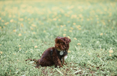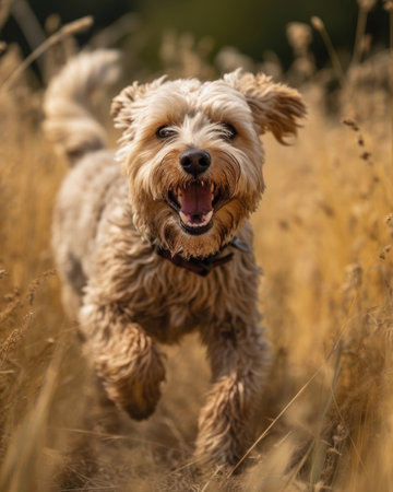 A cute and playful pet happily runs in a meadow in a close-up shot. - image generated with Generative AI