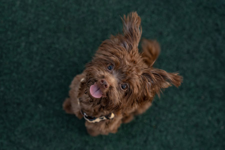 Indoor lying brown curly haired pet dog