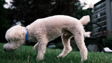 White poodle puppy running on the grass in the park. Selective focus.