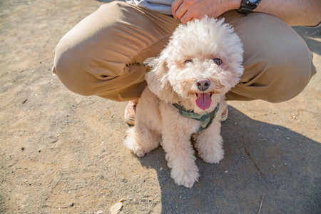 A sweet toy poodle with white curly fur sits in his female owners arms. The dog smiles with his tongue hanging out. Cuddling and caring for your pet. Caring for a small dog. An owner and their dog.