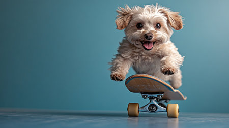 A cheerful dog rides a skateboard, displaying playful energy and joy.