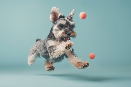 Miniature Schnauzer dog Jumping and remaining in mid-air, studio lighting, isolated on pastel background, stock photographic style